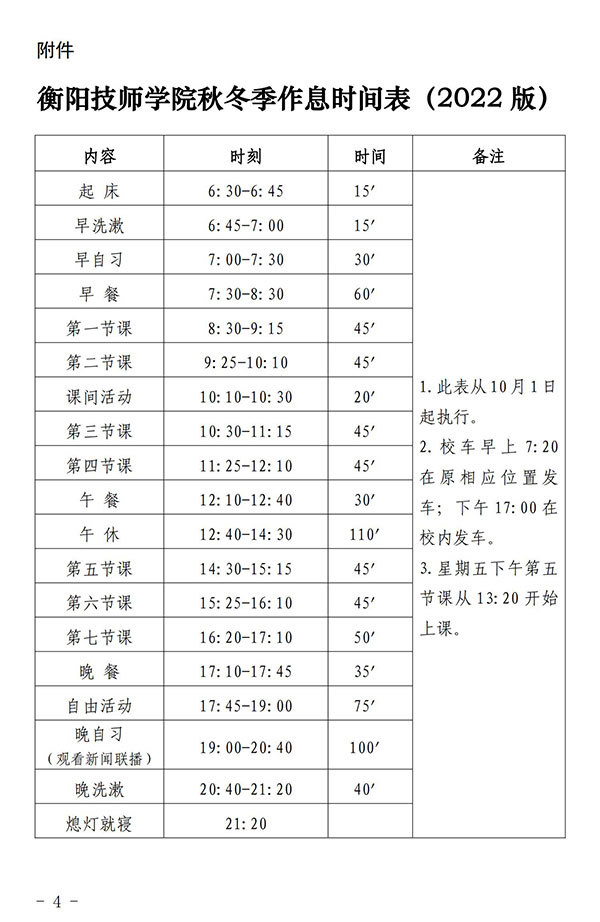 附件:衡阳技师学院秋冬季作息时间表(2022版)
