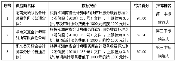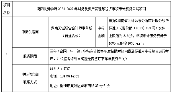 衡阳技师学院2024-2027年财务及资产管理等经济事项审计服务采购项目院内自主招标于2024年4月15日结束,现将中标结果公告如下: