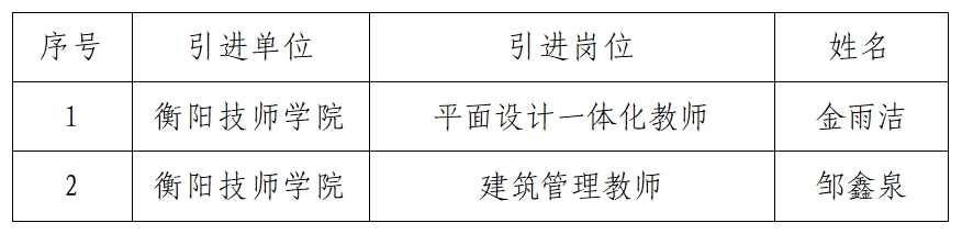 根据《2024年衡阳技师学院急需紧缺专业技术人才引进公告》的规定,经报名、资格审查、考试考核、体检、考察等程序,确定金雨洁、邹鑫泉同志为拟聘用人员,现予以公示。