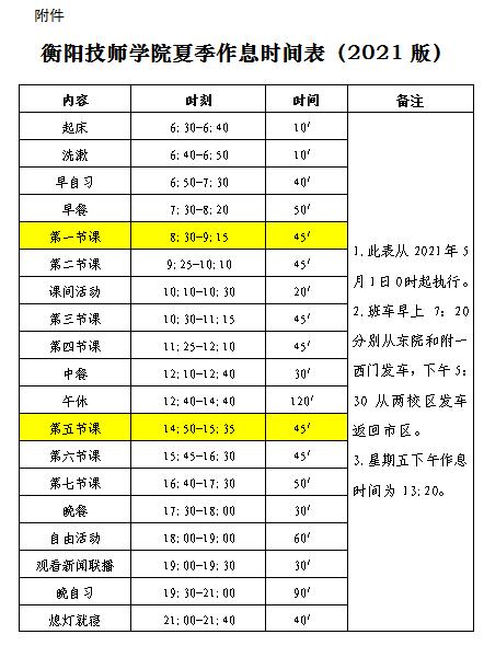 附件:衡阳技师学院夏季作息时间表(2021版)