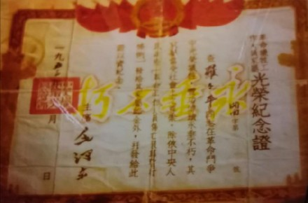 毛泽东主席亲自签发罗子平烈士光荣牺牲纪念证
