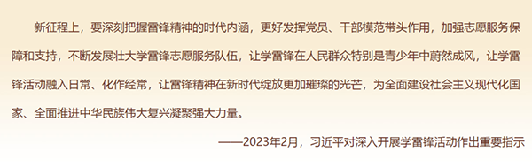 2023年2月,习近平总书记对深入开展学雷锋活动作出重要指示指出,今年是毛泽东等老一辈革命家为雷锋同志题词60周年。60年来,学雷锋活动在全国持续深入开展,雷锋的名字家喻户晓,雷锋的事迹深入人心,雷锋精神滋养着一代代中华儿女的心灵。实践证明,无论时代如何变迁,雷锋精神永不过时。