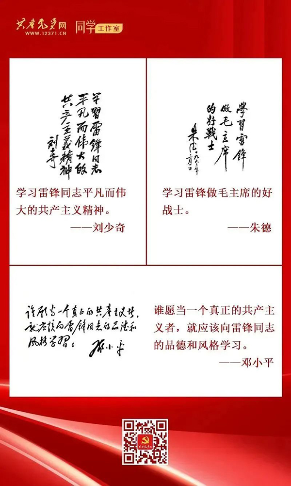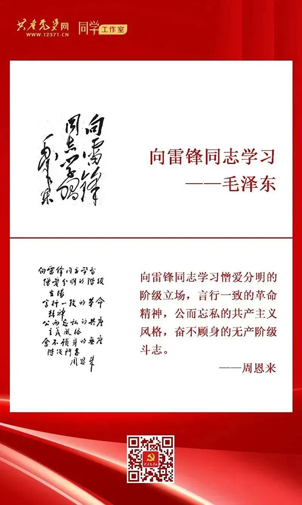 1963年1月7日,国防部命名雷锋生前所在班为“雷锋班”。1963年3月5日,毛泽东“向雷锋同志学习”题词发表。随后,刘少奇、周恩来、朱德、邓小平等老一辈革命家也相继题词,发出学习雷锋的伟大号召。