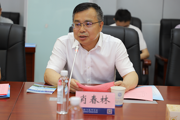 肖春林代表衡阳校友向母校领导来调研表示热烈欢迎和衷心感谢,现场汇报了衡阳技师学院的发展情况。目前学院与湘潭大学合作呈良好态势,并对未来双方合作前景充满信心,期待双方今后紧密协作,打造校校合作互利共赢、共同发展的成功典范。