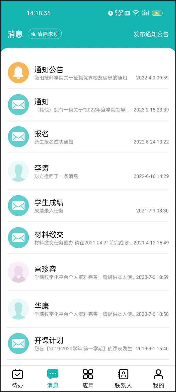 2. “消息”栏中可以接收学校发送的各种55体育的公告及交办任务,如下图所示。
