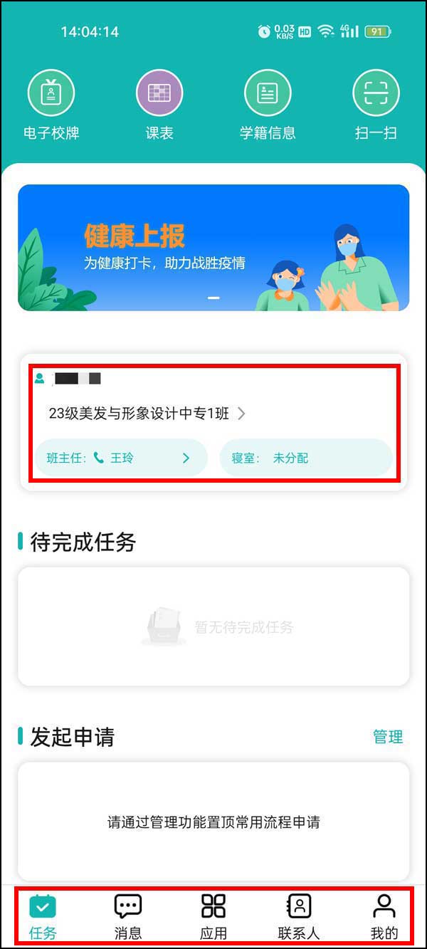 1. 登录成功后,中间位置显示姓名、所在班级、班主任姓名及55体育的联系方式,寝室到校安排,点击班级名称可显示出“班级信息”和“我的同学”等信息。最下部的导航栏可以切换显示不同的服务,如下图所示。