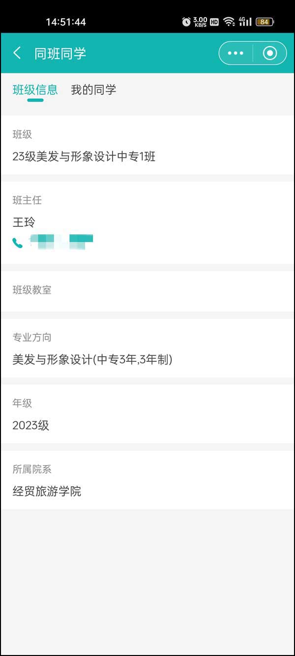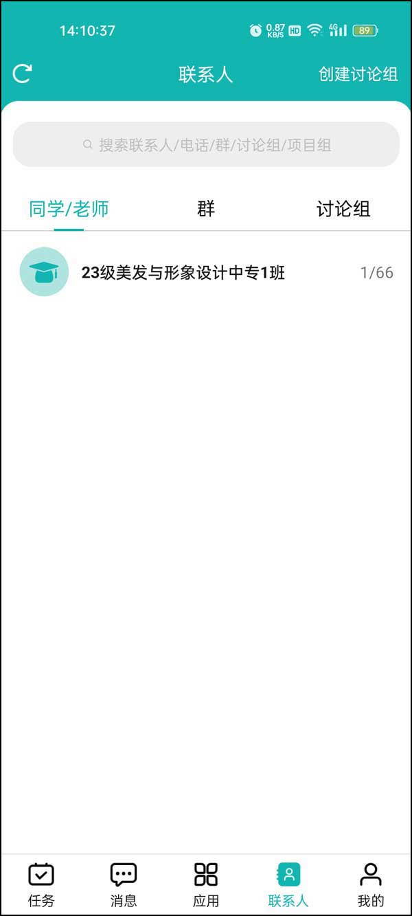 4. “联系人”栏目中可以查看到班级同学及各课程任课老师,并跟他们进行互动交流,如下图所示。