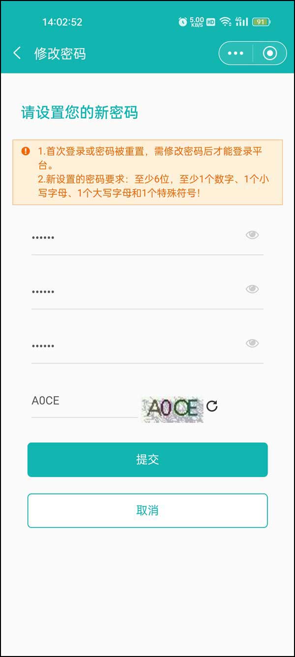 3. 第一次使用身份证号作为登录账号,密码为身份证号后六位(最后一位为x需大写)再加上bq4@@g,登录后需设置新密码再次登录方可使用,如下图所示。