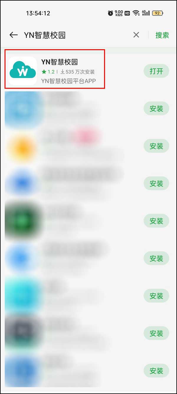 1. 在手机上打开应用市场(安卓手机在应用市场,苹果手机在app store),搜索“yn智慧校园”,进行安装并打开,如下图所示。