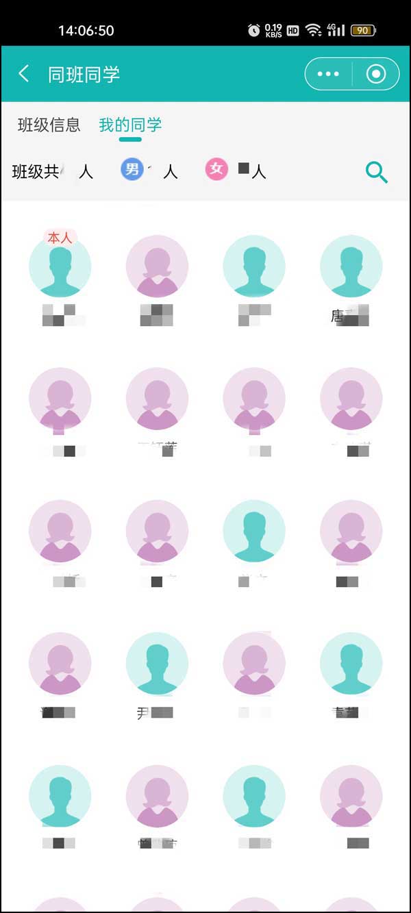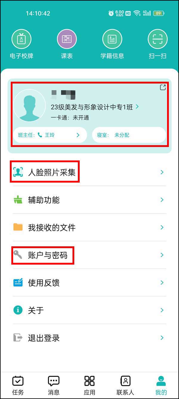 5. “我的”栏目中可以点击班级名称可显示出“班级信息”和“我的同学”等信息,进入“人脸照片采集”进行正面免冠照片拍摄并上传,进入“账户与密码”管理本人的登录账户与密码修改(如忘记密码请联系班主任重置密码),如下图所示。