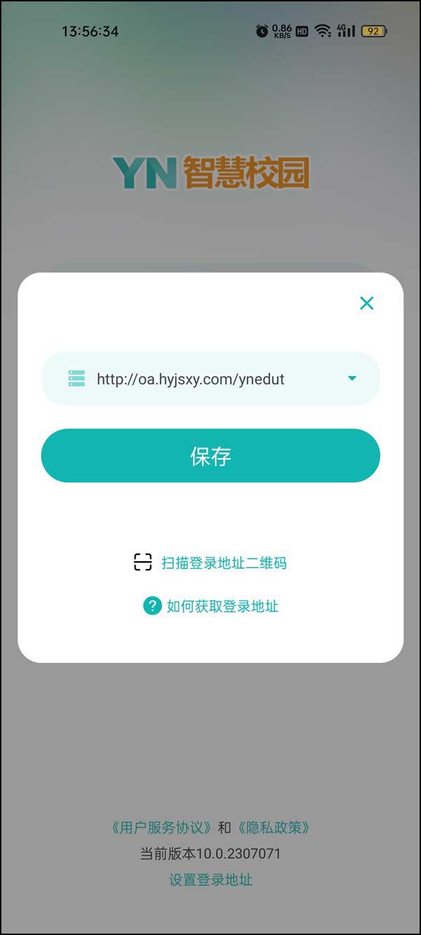 2. 第一次使用需填写“yn智慧校园”登录地址,请填入http://oa.hyjsxy.com/ynedut,或通过扫码自动填入,如下图所示。