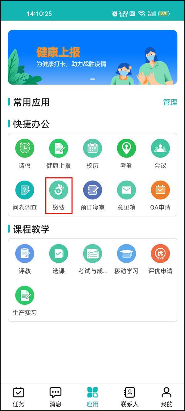 3. “应用”栏目中可以进行在线办理各项业务,例如在“缴费”选项里可以查询费用缴纳情况,如下图所示。