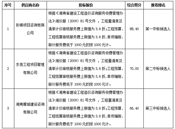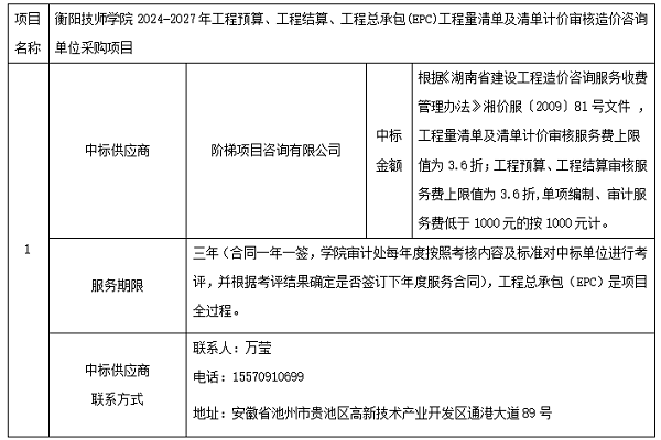 衡阳技师学院2024-2027年工程预算、工程结算、工程总承包(epc)工程量清单及清单计价审核造价咨询单位采购项目院内自主招标于2024年4月15日结束,现将中标结果公告如下: