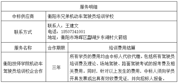衡阳技师学院机动车驾驶员培训校企合作项目于2024年5月22日结束,现将中标结果公告如下: