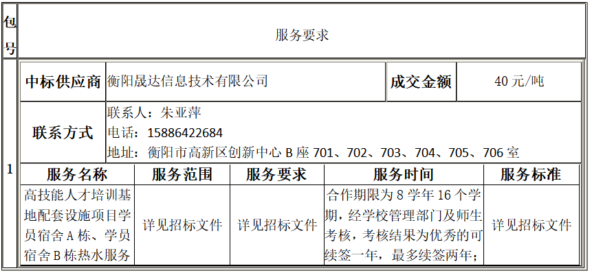 衡阳技师学院高技能人才培训基地配套设施项目学员宿舍a栋、学员宿舍b栋热水服务采购项目公开招标采购于2024年07月03日结束,现将中标(成交)结果公告如下: