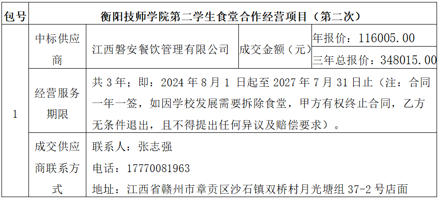 衡阳技师学院的衡阳技师学院第二学生食堂合作经营项目(第二次)竞争性磋商采购于2023年7月12日结束,现将成交结果公告如下:
