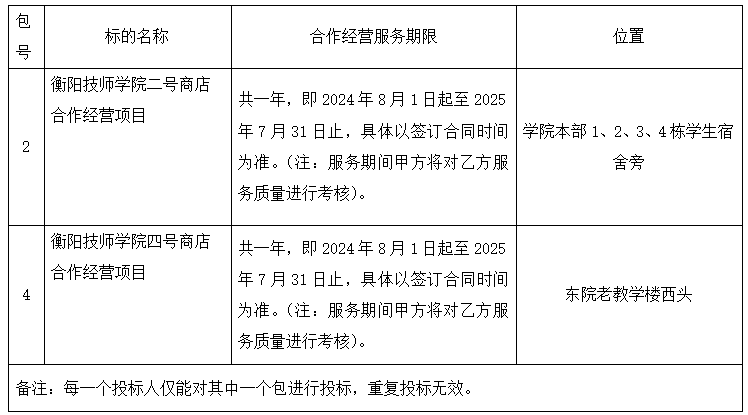 华新项目管理集团有限公司受衡阳技师学院的委托,对衡阳技师学院一号、二号、三号、四号商店合作经营项目(第三次)进行院内自主招标,邀请符合资质条件的投标人来参加投标。