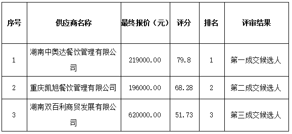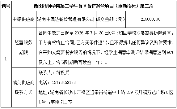 衡阳技师学院的衡阳技师学院第二学生食堂合作经营项目(重新招标)第二次竞争性磋商采购于2023年9月30日结束,现将成交结果公告如下: