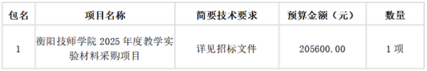 湖南省招标有限责任公司采购代理机构受衡阳技师学院的委托,对衡阳技师学院2025年度教学实验材料采购项目(委托代理编号:0623-2575n3624015)进行公开招标采购。欢迎符合资格条件的投标人前来投标。