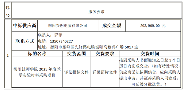 衡阳技师学院2025年度教学实验材料采购项目公开招标采购项目于2025年01月20日结束,现将中标(成交)结果公告如下: