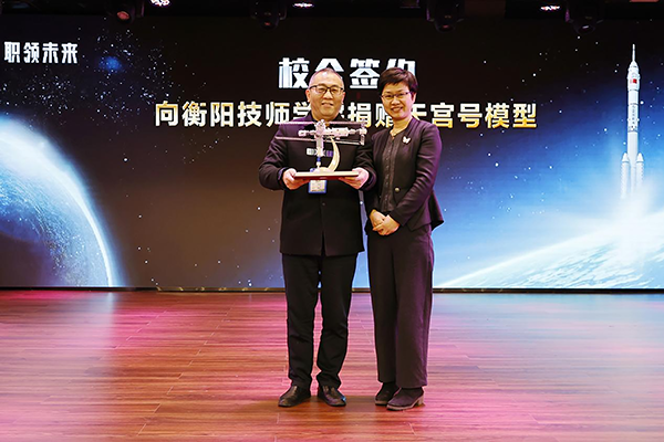 活动伊始,全体人员观看了航天主题宣传视频,回顾我国航天事业的辉煌成就。现场,学院与上海银领智造科技有限公司签署校企合作协议,周少良与企业代表王红峰共同签约,王澜代表学院接受企业捐赠的“天宫号”模型。