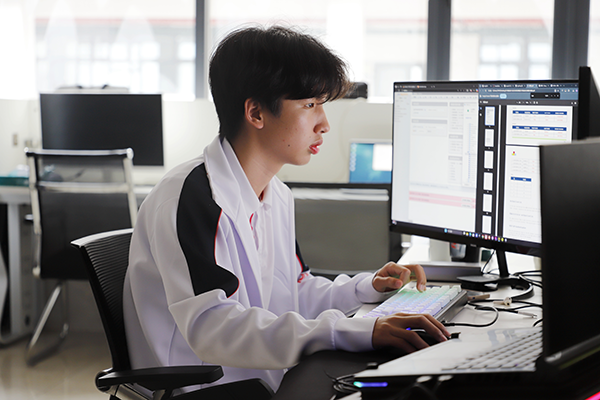 “我从小就对计算机感兴趣,喜欢敲代码,所以我选择计算机程序设计专业。”陆艺茗笑着说。2022年入校,他的兴趣变成了专业学习,在了解到网站技术这个竞赛项目后,立即报名参加该项目的校内测试选拔。通过几轮考核后,他成功进入学院网站技术项目竞赛团队,开启训练备赛的征途。
