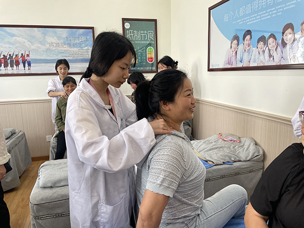 “肩颈放松按摩很舒服,身体的疲劳感也缓解了不少,感觉身体轻松了很多。”家长们在经贸旅游学院针灸按摩实训室现场体验后开心的讲道。
