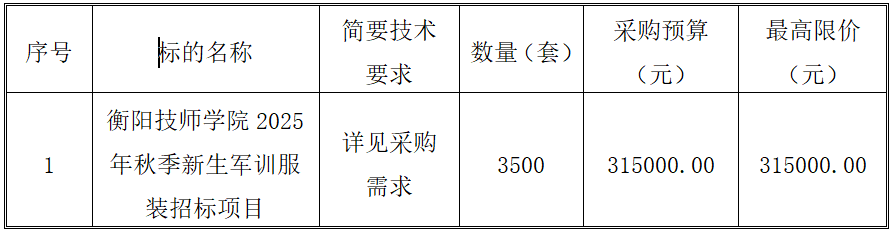衡阳福昌招标代理有限责任公司(采购人或采购代理机构名称)对衡阳技师学院2025年秋季新生军训服装招标项目(项目名称)进行院内挂网公开招标,现将采购事项公告如下: