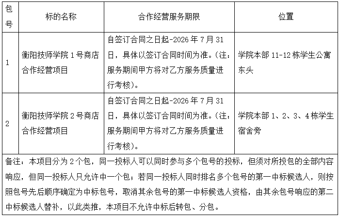 华新项目管理集团有限公司受衡阳技师学院的委托,对衡阳技师学院1、2号商店合作经营项目进行院内自主招标,邀请符合资质条件的投标人来参加投标。