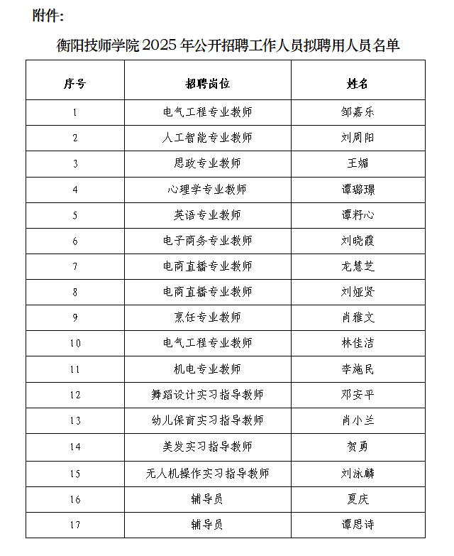 根据《衡阳技师学院2025年公开招聘工作人员公告》的规定,经报名、资格审查、笔试、面试、体检、考察等程序,确定邹嘉乐、刘周阳、王媚、谭璐璟、谭籽心、刘晓霞、龙慧芝、刘娅贤、肖雅文、林佳洁、李施民、邓安平、肖小兰、贺勇、刘泳麟、夏庆、谭思诗等17名同志为拟聘用人员,现予以公示。