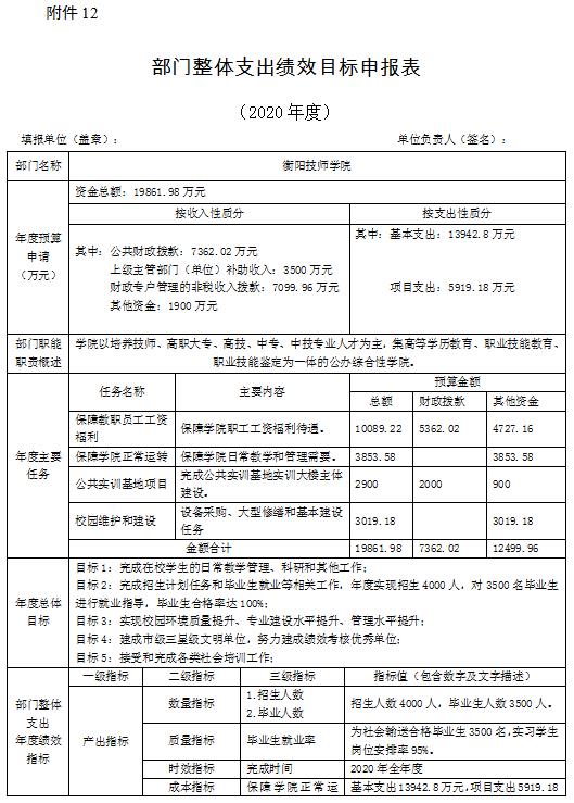 衡阳技师学院2020年部门预算和“三公”经费预算说明