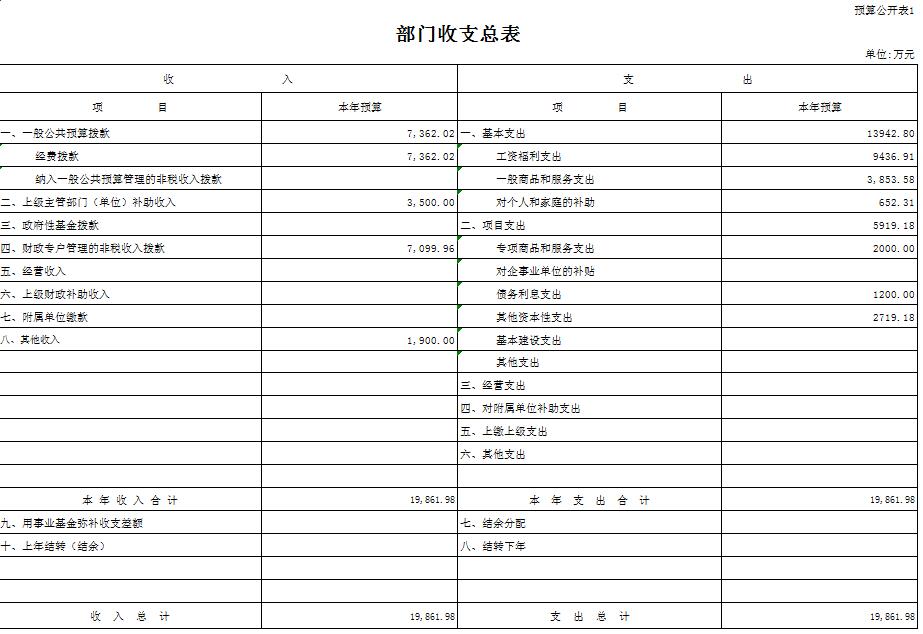 2020年部门预算编报范围包括院本部及所属二级预算单位。收入为19861.98万元;支出为19861.98万元。