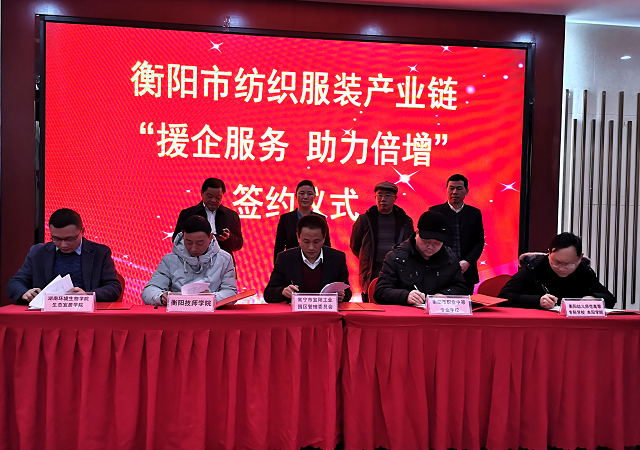 本网讯 1月15日,衡阳市纺织服装产业链“援企服务助力倍增”签约仪式在湘南纺织产业基地(常宁)举行。衡阳市委常委、宣传部长、市纺织服装产业链链长张霞,衡阳技师学院院长邱家才,常宁市委副书记、市长吴乐胜,衡阳市委宣传部常务副部长何子君参加。