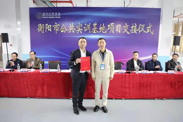 本网讯 2021年10月21日上午,衡阳市公共实训基地项目交接仪式在学院新落成的衡阳市公共实训基地二楼大厅举行。学院党委书记何东球、院长邱家才,市发改委、施工、监理、代建单位领导以及在家院领导和全体中层正职以上干部参加仪式。仪式由党委委员、副院长成朝阳主持。