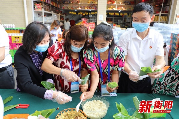 活动现场,来自新疆鄯善县的40多名学员载歌载舞,表达着“衡鄯一家亲”的喜悦之情。这些学员与大家一起,用衡阳寿岳的糯米与新疆的红枣、葡萄干包粽子、话家常,传递着湖湘儿女与天山儿女的情谊,大家欢歌笑语,共度端午佳节。