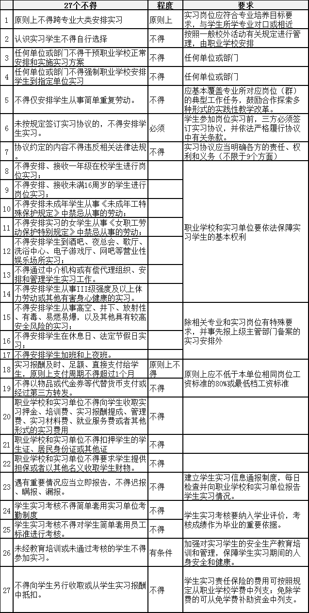职业学校学生实习管理规定的“27个不得”一览表
