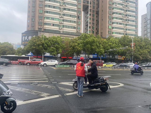 “叔叔,您好啊,非机动车不得随意掉头,逆行是非常危险的,还有请您带好头盔,安全第一。”活动中,学院志愿者正在对一位逆行的叔叔进行耐心劝导。