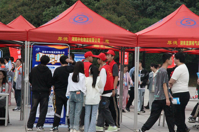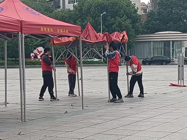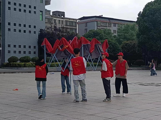前期准备阶段志愿者们认真做好招聘会会场的各项布置工作,搬桌椅、搭帐篷、摆旗帜等,志愿者们各司其职积极投入志愿服务。