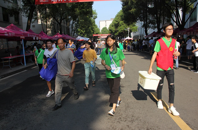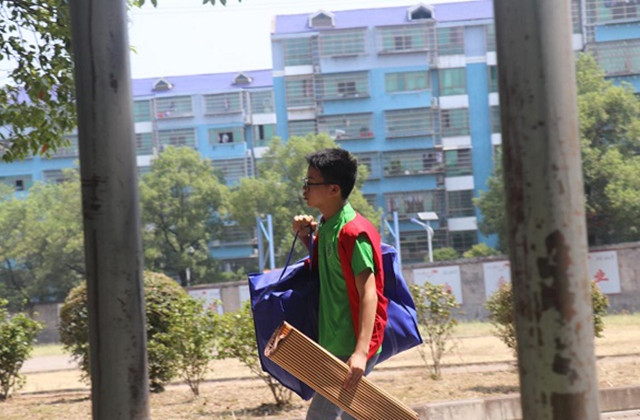 在38℃左右的高温下,志愿者们一趟一趟地帮着新同学搬运行李到宿舍,汗珠打湿了双眼和衣服,但他们的热情丝毫没有减少。有的志愿者衣服裤子都湿透了,明明宿舍就在眼前,他们却把裤腿一扎,说道:“没事,等结束了再去换衣服!”
