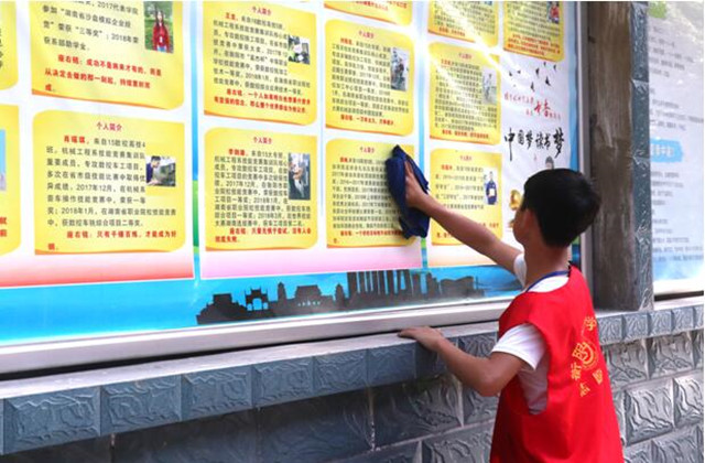 活动当天,太阳直晒大地。志愿者们用饱满的热情投入到创卫活动中,先后开展了擦拭宣传栏、“弯弯腰”、“文明宣传”、“修补红马甲”等活动,大家忙得“脸通红、汗直流”,却始终坚持在岗。