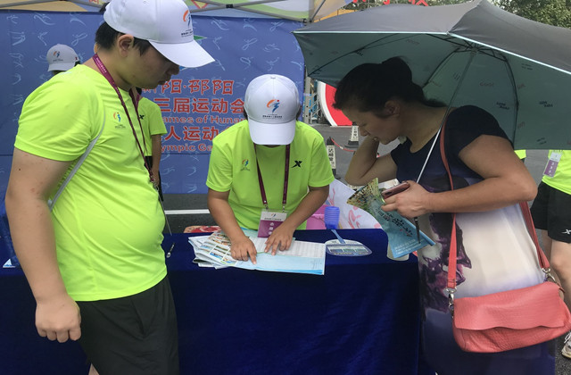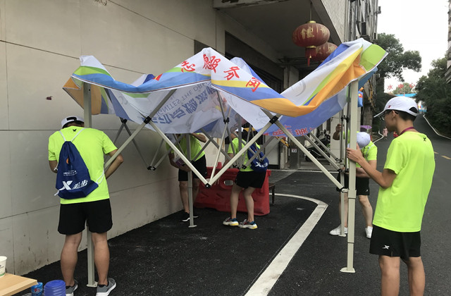 每天上午7点,志愿者们头戴白帽、身穿绿t恤到达赛场布置志愿服务场地,用热情和爱心为运动员、观众、周边群众提供水、医疗用品等物品,热心为前来咨询的市民解惑。