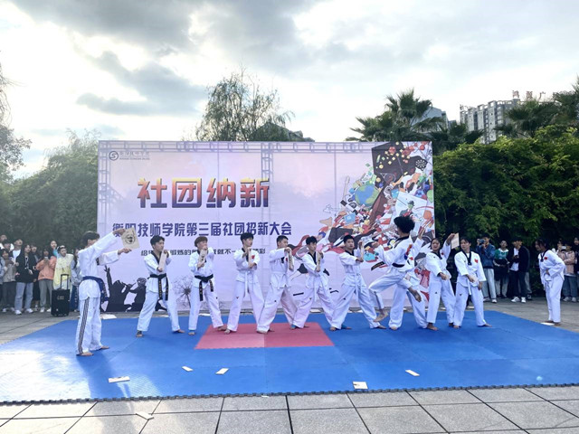 招新大会人声鼎沸,热闹非凡。社团精心布置招新点,纷纷拿出看家本领,通过摆放展板、特色活动展演和发放宣传单张等形式来展示社团特色,吸引新同学。首先,团委书记肖振衡为2019-2020学年优秀学生社团颁发了奖牌和奖金。随后各社团开展了丰富多彩的展演活动,匠心志愿者协会的志愿者们将自己参加志愿服务的经历与感受分享给同学们;汉文化社团的社员身着华丽服饰,给同学们展示和宣传汉服文化;跆拳道社团通过套路和技法表演,倡导了“礼义廉耻,忍耐克己,百折不屈”的跆拳道精神;滑板和轮滑社团通过技巧表演展现了滑板、轮滑运动的灵动;动漫社团通过角色扮演,生动展示各种动漫人物的形象;吉他协会、说唱协会、声乐团也纷纷表演了不同风格的歌曲演唱,整个展演环节形式多样,有声有色。